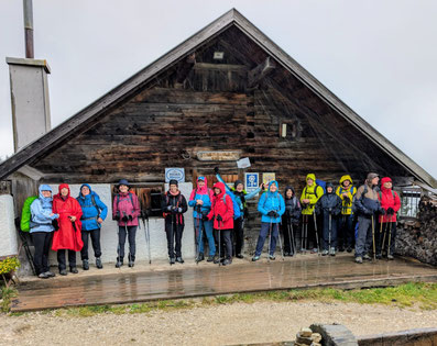Die Gruppe der Gipfelstürmer (18 Teilnehmer) wählte als Ziel das Zwölferhorn aus. Vom Parkplatz des Zwölferhorns ging es hinauf über den schwarz markierten Arnoweg zur Weisswand, weiter ging es steil aufwärts bis zur Sausteigenalm. Da wir immer wieder mit Regen- und Graupelschauern überrascht wurden, mussten wir notgedrungen einen Einkehrschwung auf der Sausteigenalm machen. Nach weiterer Überlegung folgte man doch noch dem Aufstieg über den Lichteneggersteig zum Elferstein und zum Zwölferhorn. Das Gipfelpanorama am Zwölferhorn war der Gruppe leider nicht vergönnt, jedoch beim Abstieg bis zur Weißwandgastätte gab es immer wieder kurze Lichtblicke mit schöner Wolkenstimmung auf den Wolfgangsee und dem Salzkammergut. Trotz des schlechten Wetters war die Stimmung bei den Gipfelstürmern sehr gut und sie legten eine Strecke von 10 km und 1000 Hm zurück.