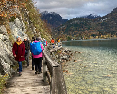 Die zweite Gruppe wählte das Schlussstück des historischen Pilgerwegs ab St. Gilgen am und oberhalb des Wolfgangsees über den Falkensteinweg. Das einige hundert Höhenmeter über den See gelegene Falkensteinkircherl aus dem 17. Jahrhundert wirkt wie aus dem Felsen gewachsen. Während eines Regenschauers diente ein Gebäude mit Quellfassung als willkommener Unterstand. Beim Abstieg wählte ein Teil der Gruppe den oberen Riedersteig. Dabei kreuzten im Wald überraschend und fotogen Feuersalamander den Weg, insgesamt viermal. Nach mittäglicher Einkehr in St. Wolfgang wanderte die Gruppe spontan weiter über die schön angelegte Promenade des Bürgelsteigs weiter bis Strobl. Damit hatten sie den Wolfgangsee in voller Länge erwandert und rund 18 Kilometer zurückgelegt. Bericht u. Bilder: Waltraud Reiter