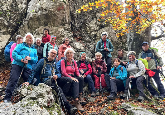 Das Kaisertal am Zahmen Kaiser bei Kufstein, erlebten die Donnerstagswanderer kürzlich mal ganz anders. Zwar ging es rauf wie gewöhnlich über die Kaiserstiege mit ihren knapp 300 Stufen. Dann wurde es jedoch beim Veitenhof gleich steil und weglos hinauf über eine Almwiese. Erst im Wald traf man auf einen Steig und der konnte unter dem reichlichen Herbstlaub am Boden nur schwer ausgemacht werden. Schließlich erreichte die Gruppe doch noch das angestrebte Ziel: die Teufelskanzel, einen spitzen gespaltenen Felszacken, von dem der Sage nach der Teufel gepredigt und den dieser dann mit einem Beil zerklüftet hat. Er wollte seine Glaubwürdigkeit beweisen, indem er den Felsen mit 3 Hieben zertrümmerte. Als er nach dem 2. Hieb noch keinen Erfolg sah, gab er auf und verschwand für immer. Nach der Rückkehr auf den Hauptweg und lustiger Einkehr im Veitenhof wurde, zwar bei Regen, eine weitere Besonderheit im Kaisertal aufgesucht: die Tischofer Höhle – 20 m breit, 40 m tief und über 8 m hoch. Erst im Juli dieses Jahres wurden bei Grabungen Gegenstände gefunden, die dem Neandertaler zugeordnet werden und rund 100.000 Jahre alt sind. Bis dato hatte man nur 30.000 Jahre alte Relikte, Tier- und Menschenknochen gefunden. Der Rückweg erfolgte dann über eine Brücke über den Kaiserbach, der sich hier eingekeilt, zwischen die Felswände zu beiden Seiten, ins Tal drückt. Eine ellenlange Stahltreppe auf der gegenüberliegenden Seite führte aus der Klamm heraus und auf angenehm fallenden Steigen ging es zurück zum Ausgangspunkt. Bericht u. Bild: Gina Heinrich