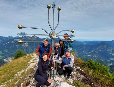 Bei bestem Bergwetter starteten die Donnerstagswanderer des Alpenvereins zum Wanderparkplatz Aschenau an der B 305. Aufwärts ging es gleich schweißtreibend zuerst auf einer Forststraße und dazwischen auf einem Steig bis sich der Weg zweigte. Den Fahrweg zum Rauschberg rechts liegenlassend wanderte die Gruppe weiter bei angenehmer Steigung und einem leichten Wind hinauf zum Gipfelkreuz des Streichers. Rundum die Chiemgauer Berge im Blick wurde gebrotzeitelt und man machte sich nur schweren Herzens an den Abstieg. Da wurde es für den einen oder anderen schon noch spannend, denn der gewählte Knappensteig erforderte volle Konzentration und Beinschmalz. Aber letztendlich kamen alle gut ins Tal und bei der Fahrrieskapelle wurde noch eine kurze Pause eingelegt, bevor man die letzte Etappe zum Parkplatz antrat.