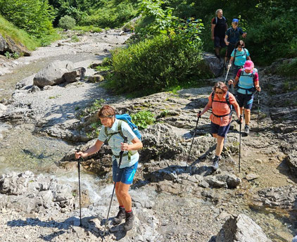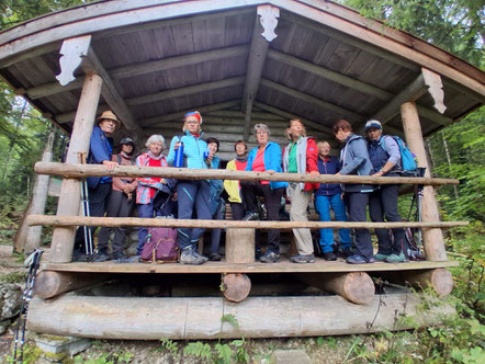 Bei strahlendem Sonnenschein machten sich die Donnerstagswanderer auf den Weg nach Schneizlreuth. Vom Haiderhof ging es erst einmal durch die atemberaubend schöne und wilde Schlucht der Aschauer Klamm, um anschließend das Achhorn zu erklimmen. Diese Erhebung ist Teil des Achberges und gehört noch zur Reiter Alpe. Das „ach“ kam über so manche Lippe, denn der mit 1316 m relativ niedrige Berg hatte es ganz schön in sich. Felsbrocken, Wurzeln und Wasserrinnen im steilen Gelände forderten die ganze Aufmerksamkeit beim Gehen und man musste schon innehalten, um einen Blick auf die nahen Gipfel von Weitschartenkopf und die Drei Brüder zu werfen. Oben angekommen war dann die Sicht frei für die weiteren Berge im Umfeld. Nach der Rast am Kreuz und dem Abstieg ging es wieder zurück über die Klamm zum Ausgangspunkt mit immer wieder neuen imposanten Eindrücken. Die abschließende Einkehr beim Wurznwirt in Schneizlreuth ließ den schönen Tag ausklingen. Bericht u. Bild: Gina Heinrich