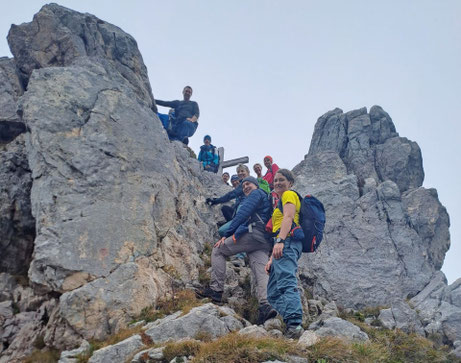 Einmal im Jahr lasse ich die Teilnehmer auswählen, welches Ziel wir ansteuern. Bei der diesjährigen „Wünsch dir was“-Abstimmung fiel das Ergebnis auf den Hohen Göll. Da es heute sehr bewölkt und kaum Sonne angekündigt war, konnten wir bei angenehmen Temperaturen über das Alpeltal aufsteigen. Dies ist zwar der leichteste Weg auf den Göll, trotzdem nicht zu unterschätzen. Immer wieder gibt es kleinere Klettereinlagen und die Wegfindung ist nicht ganz einfach. Der Pfad zwischen den Markierungen ist mal mehr mal weniger zu erkennen. Diesen Anspruch konnten alle Teilnehmer gut meistern. Leider wurde die Sicht mit der zunehmenden Höhe immer schlechter, so dass wir die Tour bei 2200 Metern Höhe abbrechen mussten. Im Abstieg gab es dann bei einer geeigneten Stelle die verdiente Pause. Später beim Abstieg kam dann die Sonne doch noch raus, doch der Göll war weiterhin in Wolken verhüllt. Bei der Heimfahrt wurde noch im Café „Goldmarei“ in Waging eingekehrt das sehr zu empfehlen ist. Bericht u. Bild: Franz Pöschl