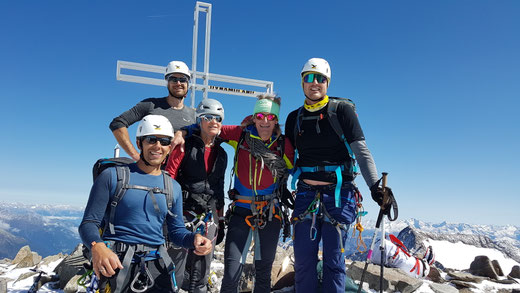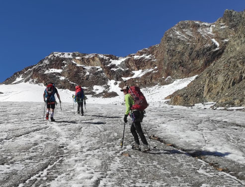 Anfang September starteten wir die 3-Tages-Hochtour Richtung Hildesheimer Hütte. Die ersten Kilometer durch das Windachtal wurden mit dem MTB bis zum Materiallift der Hildesheimer Hütte zurückgelegt. Vom Regen begleitet, der mit zunehmender Höhe in Schnee überging, mussten die letzten 400 Hm zu Fuß zur Hütte (2.999 m) bewältigt werden. Allesamt durchgefroren ließen wir in der warmen Hüttenstube diesen Tag ausklingen. Am Samstag führte uns der Weg über Gletscher und den ersten Grat hinauf zum Pfaffenkogel auf 3.366 m. Von dort ging es weiter hinab zu einer sanften Gletscherpassage bis zum finalen Aufstieg zum Wilden Pfaff mit 3.456 m. Bei der verdienten Rast genossen wir den fantastischen Ausblick auf das Zuckerhütl, den Wilden Freiger und die entfernteren Dolomiten. In leichter Kletterei folgte der Abstieg über den Ostgrat Richtung Müllerhütte. Hier querten wir den Übertalfernergletscher und folgten dem Ostgrat gen Sonklarspitze auf 3.444 m. Jetzt blieb nur noch die kurze Passage zum letzten Gipfel unserer Tour, das Hohe Eis mit 3.396 m. Den Abstieg zur Siegerlandhütte meisterten wir über den Südwestgrat, dann weiter über Blockgelände. Die Hütte erreichten allesamt zufrieden rechtzeitig zum Abendessen. Unser Sonntag begann bei einem gemütlichen Abstieg zum Lift, um dort auf die Räder zu wechseln und eine sommerliche Abfahrt durch das bezaubernde Windachtal zu den Autos zu genießen. Bericht u. Bild: Oliver Fuhrmann